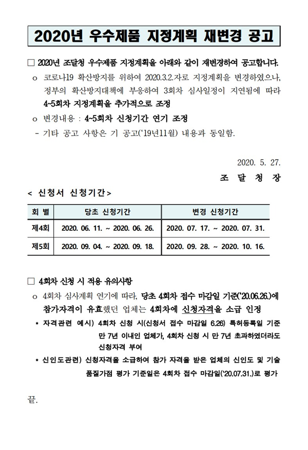 조달청 우수제품구매과에서 2020년 우수제품 지정 일정에 대한 재변경 계획이 공고되었습니다.