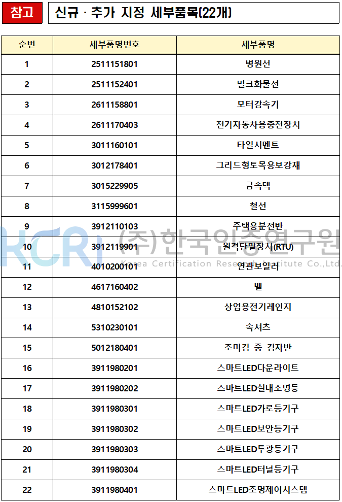 주요 신규 및 추가 지정 품목으로는 금속덱(3015229905), 벨(4617160402), 전기자동차용충전장치(2611170403), 상업용전기레인지(4810152102) 등이 있습니다.