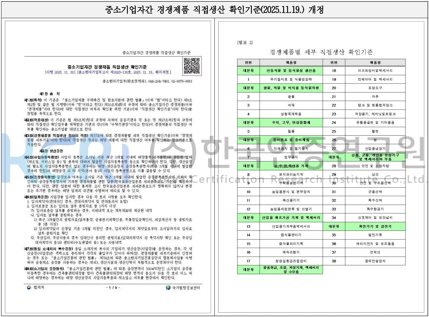 2025년 11월 19일 자로 중소기업자간 경쟁제품 직접생산 확인기준이 개정되었습니다.