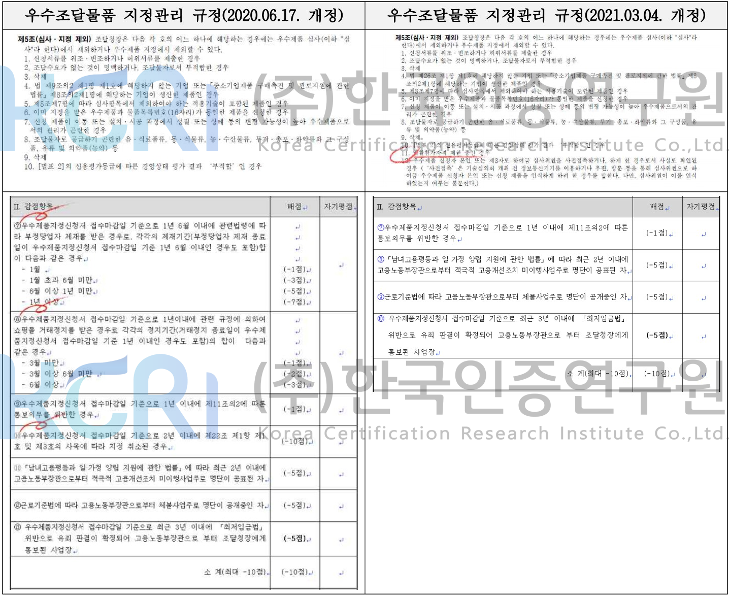 지정 심사 측면에서는 심사 체계 중 신인도심사 항목에서 부정당 제재 및 쇼핑몰 거래정지 이력에 대한 감점 항목 등이 삭제되었습니다. 대신 부정당 제재로 인하여 입찰참가자격이 제한 중인 물품에 대하여 우수조달물품 지정 심사 및 지정 대상에서 제외되도록 하는 규정이 명문화되었습니다.