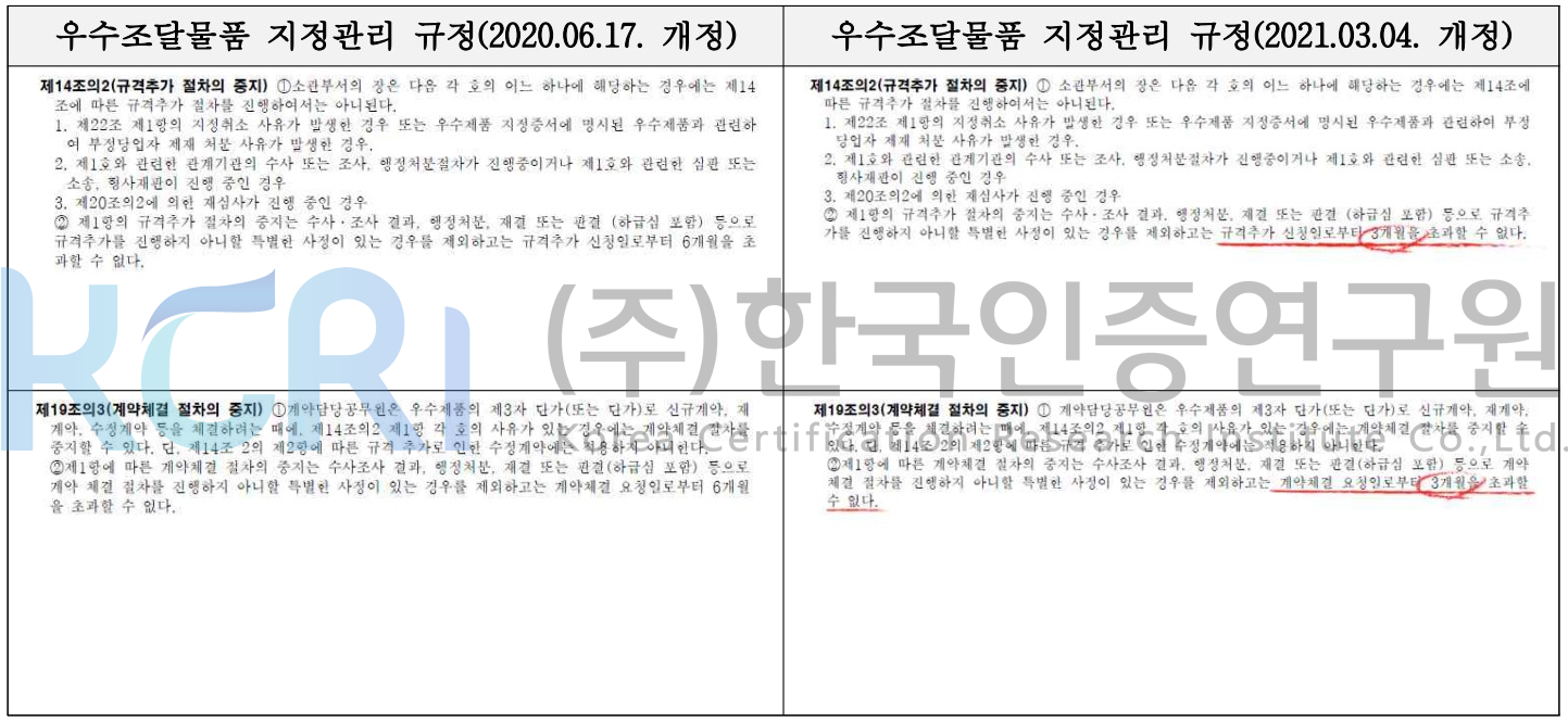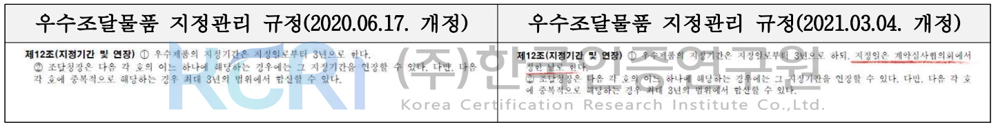 개정된 규정은 3월 1일부터 시행되므로 2021년도 우수조달물품 지정 신청을 계획·추진 중인 업체들께서는 관련 규정에 착오가 없으시도록 각별히 유의하시기 바랍니다.