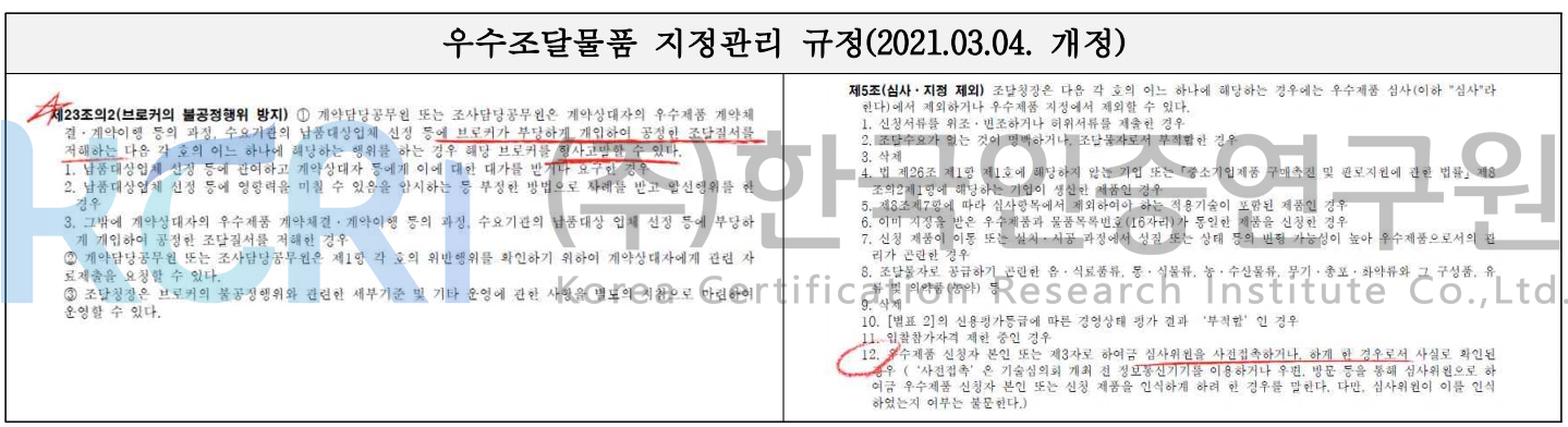 마지막으로, 불공정 행위에 대한 관리 강화 측면에서는 우수조달물품 심사 및 지정 제외와 형사고발에 대한 근거가 명문화되었습니다. 이는 우수조달물품 지정 심사에 개입하려는 행위에 대하여 엄격히 단속하고 심사 과정이 공정하게 이루어질 수 있도록 하기 위함으로 풀이됩니다.